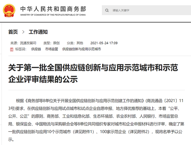 商务部此次公示的“全国供应链创新与应用示范城市和示范企业评审结果”,是商务部、工业和信息化部、生态环境部、农业农村部、人民银行、市场监管总局、银保监会、中国物流与采购联合会等8单位共同组织专家对城市和企业申报材料进行评审确定的结果。
